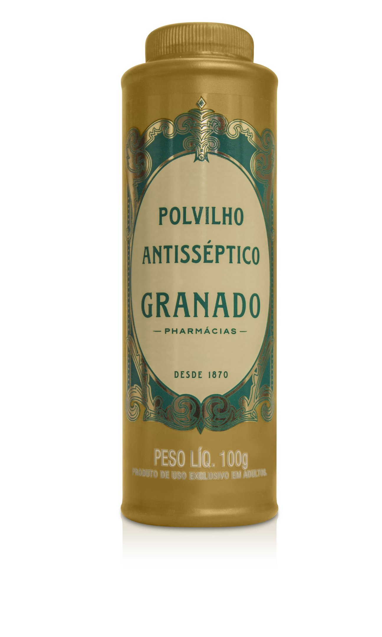 O clássico talco da granado têm ações antisséptica, secativa e antimicrobiana, combate assaduras, brotoejas e os odores da transpiração dos pés, além de previnir pruridos e frieiras.