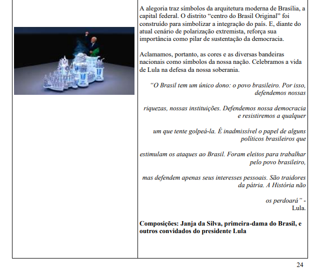 O desconto pode acontecer pois o livro “Abre-alas” – documento com informações para acompanhamento do desfile – ainda continha o nome de Janja como parte da atração. O material é entregue anteriormente para os jurados e não foi atualizado a tempo sobre a desistência. A primeira-dama aparecia na seção “Composições” do 5º carro como “Janja da Silva, primeira-dama do Brasil, e outros convidados do presidente Lula”.
