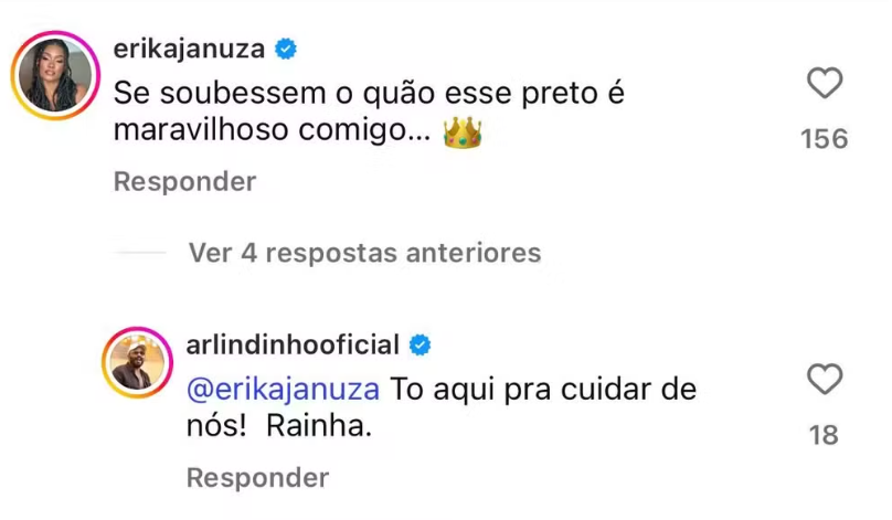 Arlindinho e Erika Januza confirmam o namoro, no entanto, preferem manter na discrição e desde a confirmação do envolvimento não apareceram juntos publicamente. No início da semana, o sambista, filho de Arlindo Cruz, foi alvo de outra internauta, que disse não acreditar que os dois estejam juntos. “Não acredito que a Erika está com isso”, escreveu ela, sendo rebatida por Arlindinho: