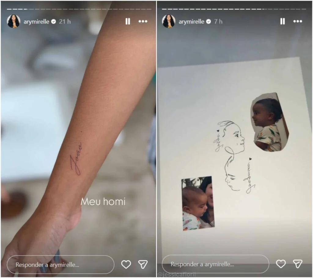 Já nos Stories, a blogueira exibiu a tatuagem com o nome “João” na lateral do braço direito, na altura do pulso. “Meu homi”, legendou ela. Ary Mirelle contou, ainda, que retocou um desenho de borboletas que ela tem nas costelas.