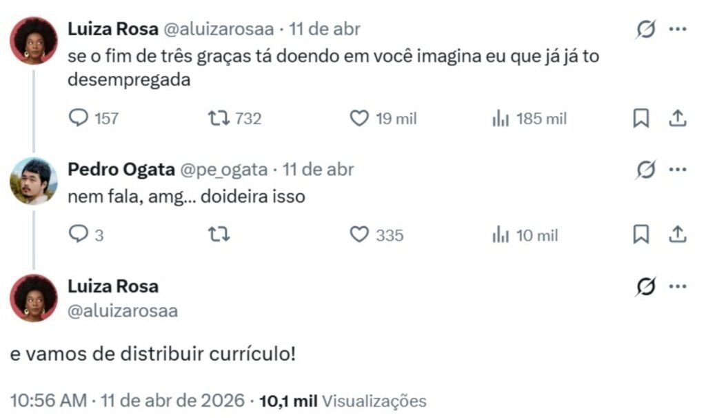 Ao responder em uma postagem no X, no último final de semana, a atriz abriu o coração e expôs seu sentimento de apreensão com o fim de mais um trabalho. “Se o fim de Três Graças está doendo em você, imagina em mim, que já, já estou desempregada”, declarou Luiza, que também atuou em “Mar do Sertão” (Globo, 2022) e “Guerreiros do Sol” (Globoplay, 2025).