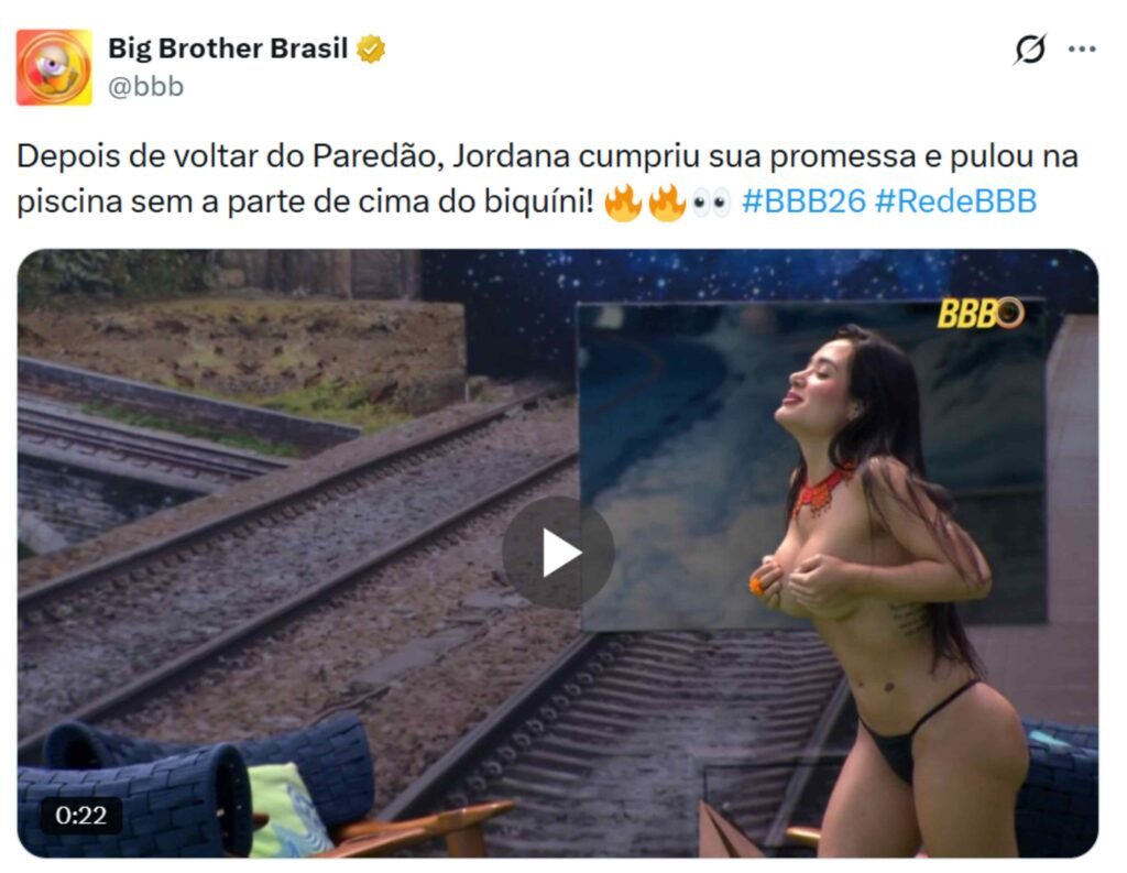 “Vem, amiga!”, disse Jordana a Marciele, aos risos, convidando a amiga a compartilhar do momento de felicidade. Lodo depois, a dançarina ajuda a advogada a vestir a parte superior do biquíni novamente. “Essa é a minha guerreira!”, reage a Cunhã-Poranga. “Pronto, paguei! Obrigada, Brasil”, continua a brasiliense, se referindo à promessa.