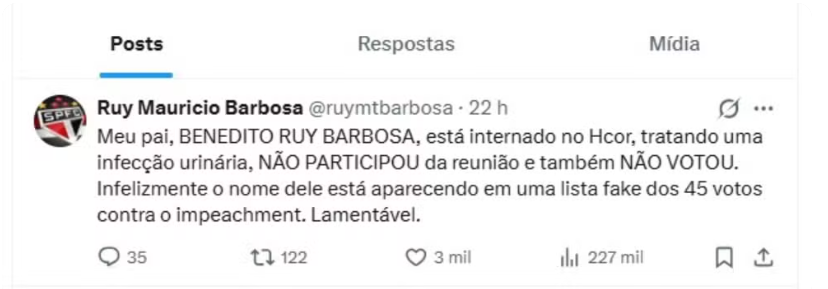 “Meu pai, Benedito Ruy Barbosa, está internado no HCor, tratando uma infecção urinária, não participou da reunião e também não votou. Infelizmente o nome dele está aparecendo em uma lista fake dos 45 votos contra o impeachment. Lamentável”, escreveu Ruy Mauricio, no X. O dramaturgo foi internado no dia 3 de janeiro devido à infecção, que está diretamente associada a um quadro de insuficiência renal crônica.