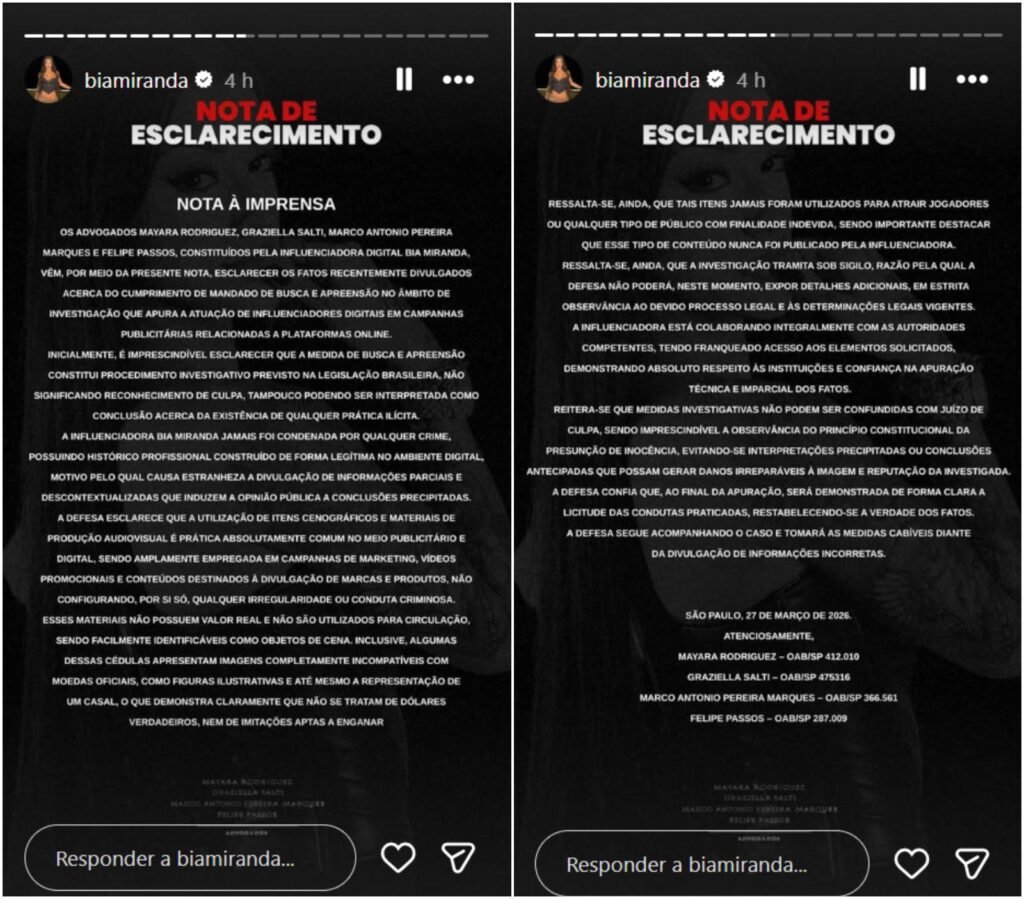 A ação contra Bia Miranda teve início após a Secretaria de Prêmios e Apostas do Ministério da Fazenda identificar que a influenciadora permanecia divulgando ativamente os sites clandestinos, mesmo após ter sido alvo da primeira fase da operação, em agosto do ano passado.