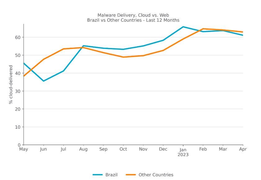 O estudo divide os apps maliciosos no quesito distribuição em duas categorias: distribuídos via apps ou serviços de nuvem e distribuídos via web, ou seja, hospedados diretamente em sites. Segundo o relatório, feito a partir da análise de dados de clientes corporativos da Netskope, a percentagem de apps maliciosos distribuídos via nuvem cresceu de 45% em maio do ano passado para 61% em abril deste ano na internet brasileira. A empresa observa que este crescimento acompanha uma tendência mundial do uso cada vez maior de serviços e apps de nuvem para distribuição de conteúdo malicioso.