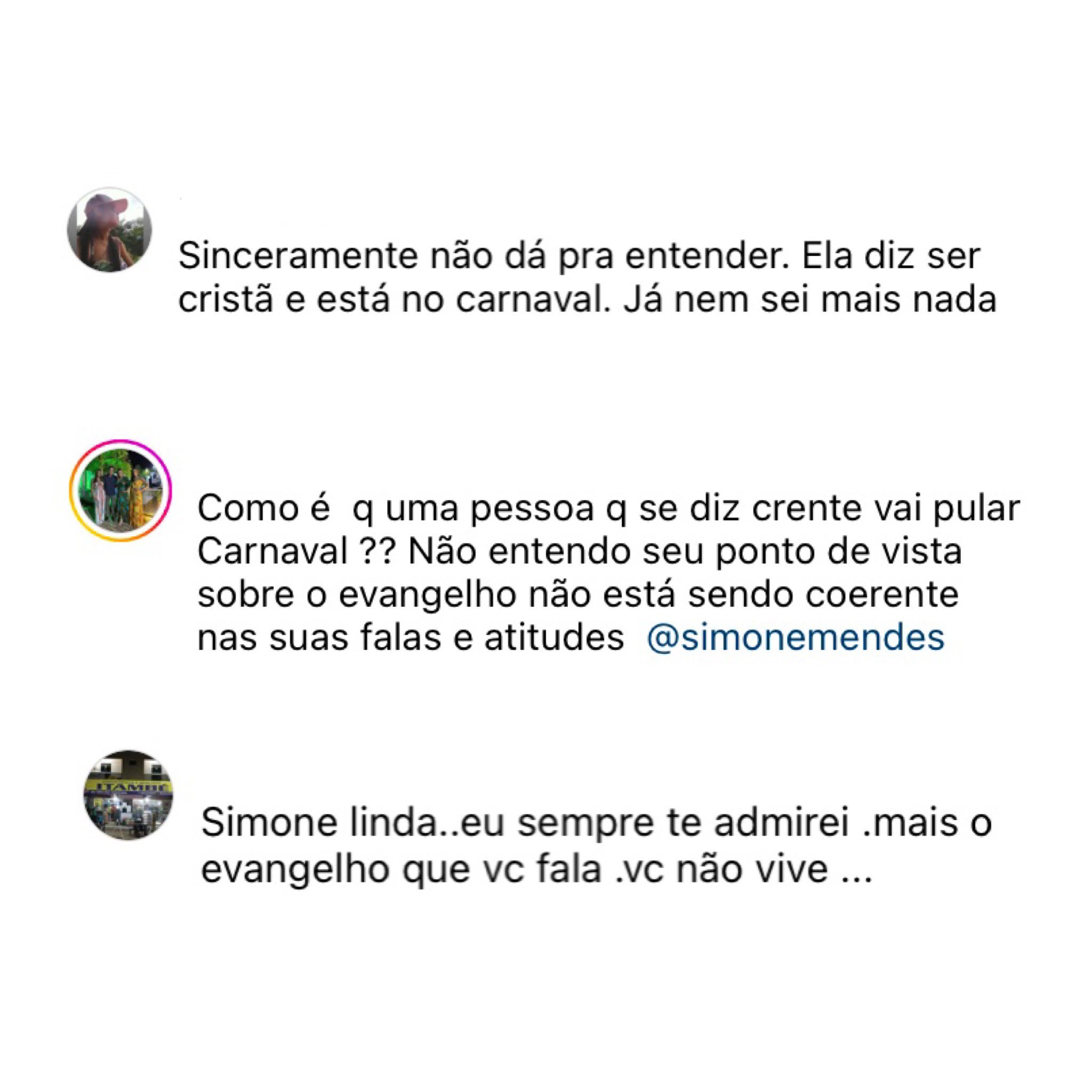 “Sinceramente não dá para entender. Ela diz ser cristã e está no carnaval. Já nem sei mais nada”, diz uma fã. “Como uma pessoa que se diz crente vai pular Carnaval?”, questiona outro.