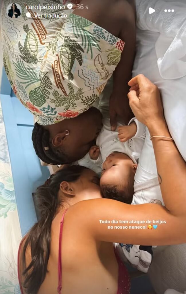 Nos stories, a influenciadora compartilhou cliques enquanto ela e o parceiro enchiam o filho de beijos. “Todo dia tem ataque de beijos no nosso neneco”, escreveu Carol na legenda.