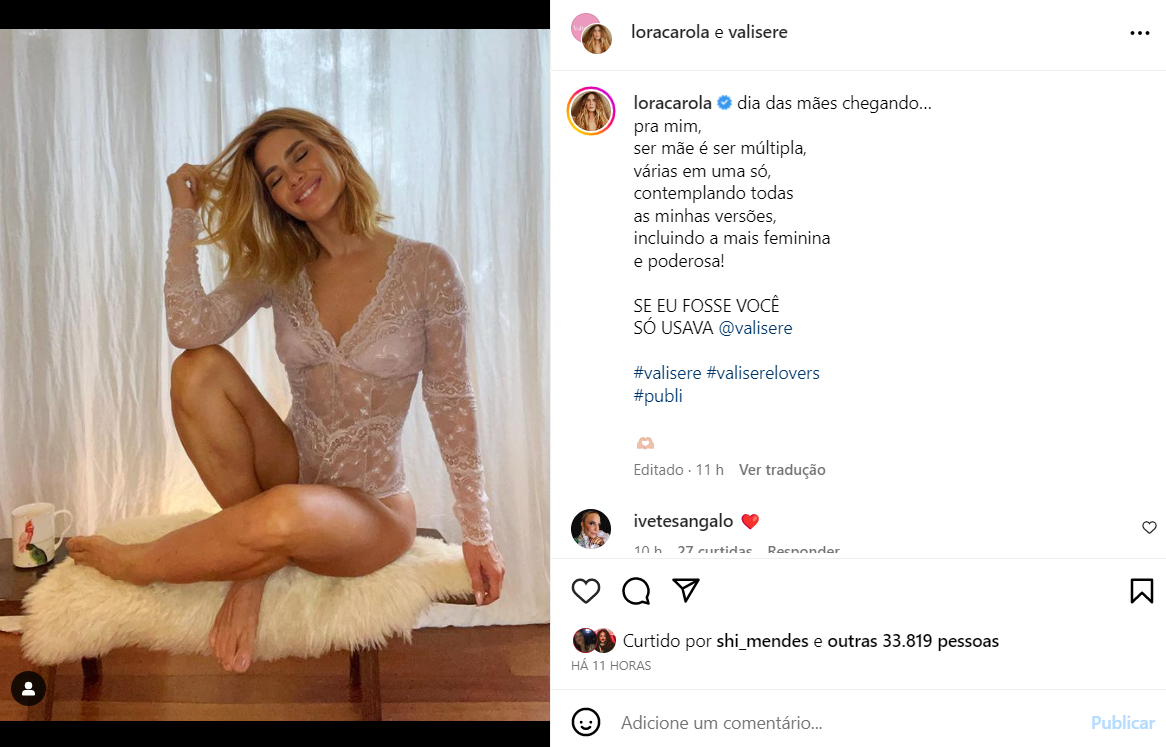 Na legenda, poetizou: “dia das mães chegando… pra mim, ser mãe é ser múltipla, várias em uma só, contemplando todas as minhas versões, incluindo a mais feminina e poderosa!”