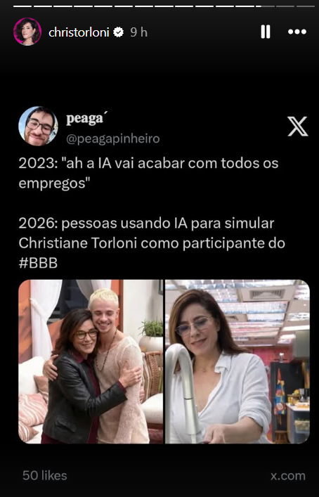 Após a repercussão positiva do comercial, a atriz foi para o seu Instagram celebrar as montagens dos fãs. Ao longo desta quarta-feira, 4, ela republicou diversas montagens, memes e piadas sobre sua “participação” no BBB 26. Apesar de não tecer nenhum comentário sobre as publicações, Torloni encheu os seus stories com o carinho do público.