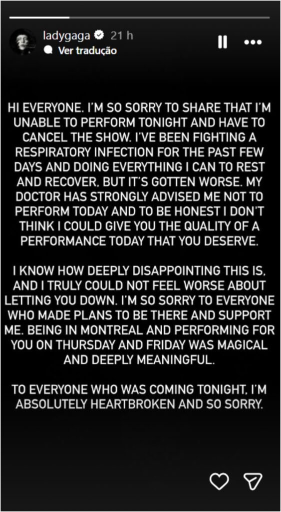 Gaga também disse que não teria condições de manter o nível esperado pelo público. “Sendo sincera, não acho que conseguiria entregar a qualidade de performance que vocês merecem”, completou a cantora no comunicado.