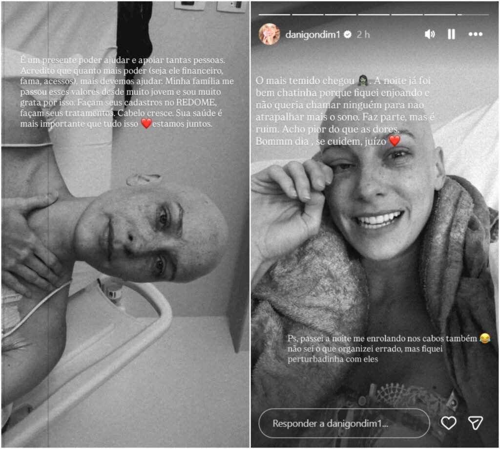 Dani tem compartilhado as etapas do seu tratamento oncológico, através das redes sociais, onde também mostra como está enfrentando esse momento, destacando que conta com a família para formar uma rede de apoio. Ela também levantou a bandeira da doação de medula óssea, apesar do transplante de medula não envolver o tratamento para o tipo de câncer que ela desenvolveu. “Quanto mais poder você tem, seja poder financeiro, seja poder midiático, quanto mais poder, mais você tem que retribuir à sociedade”, explica ela.
