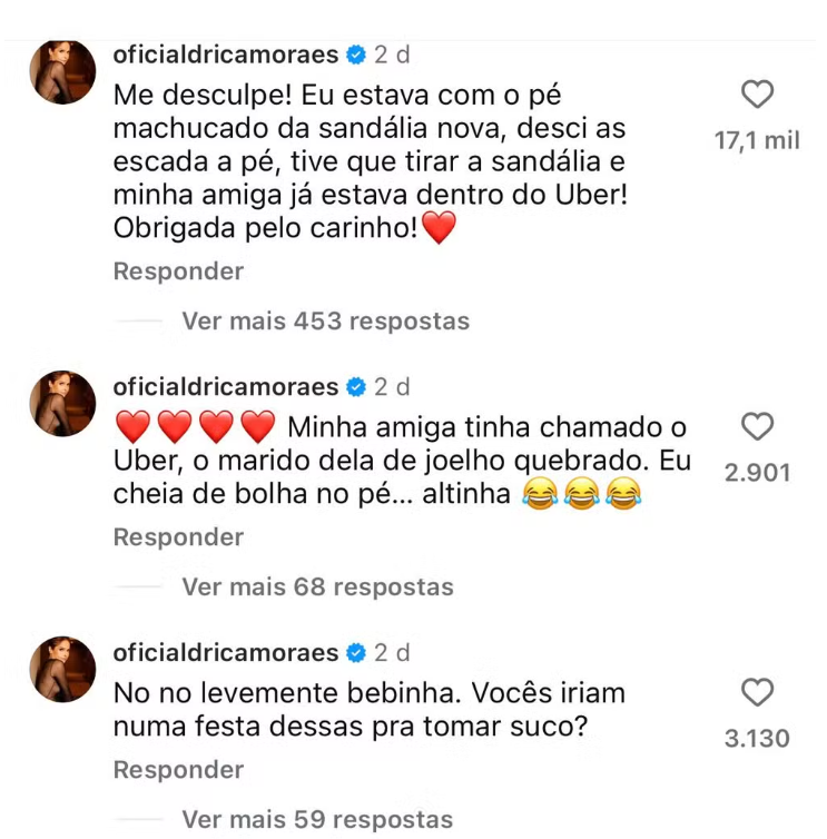 Ao publicar o vídeo, o fã escreveu: “Drica Moraes disse ‘não’ na minha cara, mas explicou o motivo que não poderia tirar foto”. Após repercussão, Drica escreveu: “Me desculpe! Eu estava com o pé machucado da sandália nova, desci as escada a pé, tive que tirar a sandália e minha amiga já estava dentro do Uber! Obrigada pelo carinho!”.