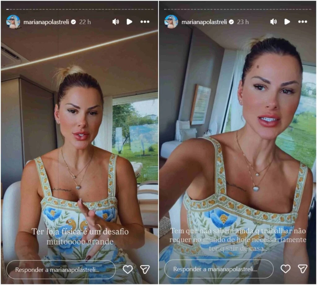 Mariana disse que manteve duas lojas físicas por 11 anos, e que cumpria a responsabilidade de realizar compras, negociações e atendimento, o que exigia muitas viagens. Também era função dela gerir as redes sociais. Ela atuava, ainda, como modelo da própria marca.