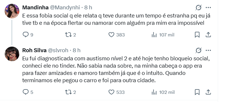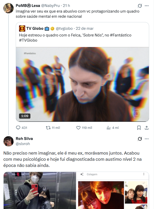 Tudo começou depois que um perfil escreveu a seguinte mensagem na postagem da Globo: “Imagina ver seu ex, que era abusivo com você, protagonizando um quadro sobre saúde mental em rede nacional”. Na sequência, Roh Silva respondeu: “Não preciso nem imaginar, ele é meu ex, morávamos juntos. Acabou com meu psicológico e hoje fui diagnosticada com autismo nível 2, na época não sabia ainda”.