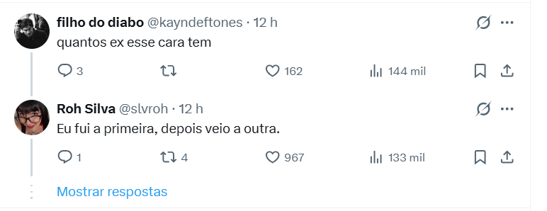 Outros usuários do X questionaram a veracidade das imagens postadas pela jovem e se ela, de fato foi namorada de Felca. Além disso, teve gente que resgatou outra acusação de abuso psicológico vinda de outra ex-namorada do influenciador. “Eu fui a primeira, depois veio a outra”, explicou Roh Silva, conforme ilustrado nas mensagens a seguir: