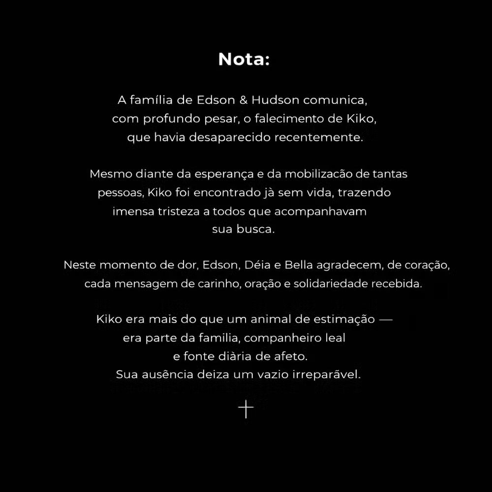 A notícia foi divulgada pelas redes sociais oficiais da dupla sertaneja, expressando a profunda tristeza da família. Edson, sua esposa Déia e a filha Bella, que se mostrou muito abalada com a ausência do pet, lamentaram a perda. Anteriormente, o cantor havia expressado a preocupação da filha: “Nossa pequena Bella está muito triste, e queremos muito trazer o Kiko de volta pra casa.”