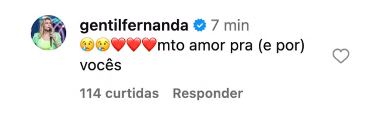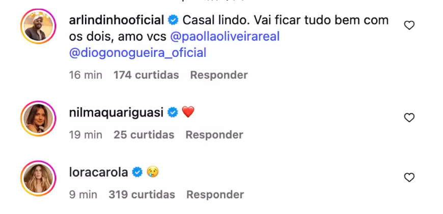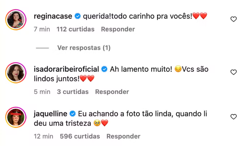 “Querida, todo o carinho para vocês!”, desejou Regina Casé. “Eu achando a foto tão linda, quando li deu uma tristeza”, disse a jogadora de vôlei Jaquelline. “Casal lindo. Vai ficar tudo bem com os dois, amo vocês”, disse Arlindinho, amigo próximo do então casal. “Seja feliz Kukla! Te amo”, escreveu Claudia Raia.