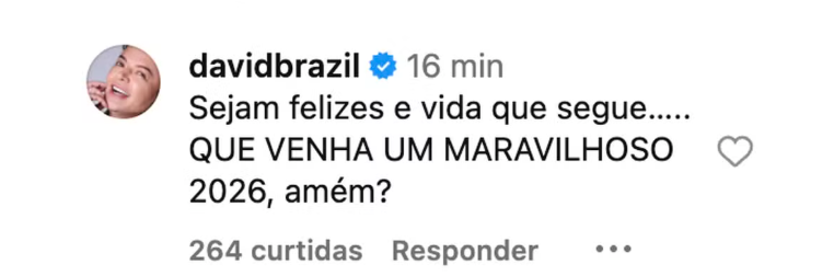 A atriz Fabiana Karla se declarou: “Que Deus acalme o coração de vocês e que sigam seus caminhos da melhor forma e preservando o que de bom ficou. Vocês são lindos e merecem ser felizes do jeito que escolheram. Paz no coração”. “Eu amo os dois! Peço a Deus que ilumine o caminho de vocês, sejam felizes”, disse Cacau Protásio.