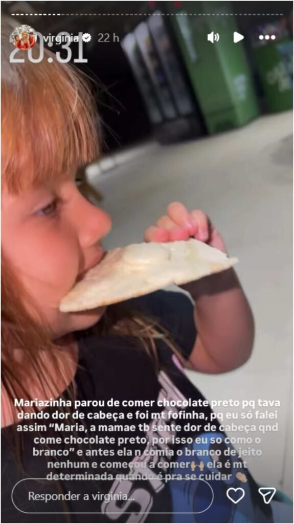 “Mariazinha parou de comer chocolate preto porque estava dando dor de cabeça e foi muito fofinha porque eu só falei assim: ‘Maria, a mamãe também sente dor de cabeça quando come chocolate preto, por isso eu só como o branco’. E antes ela não comia o branco de jeito nenhum e começou a comer. Ela é muito determinada quando é para se cuidar”, disse Virginia em uma das postagens.