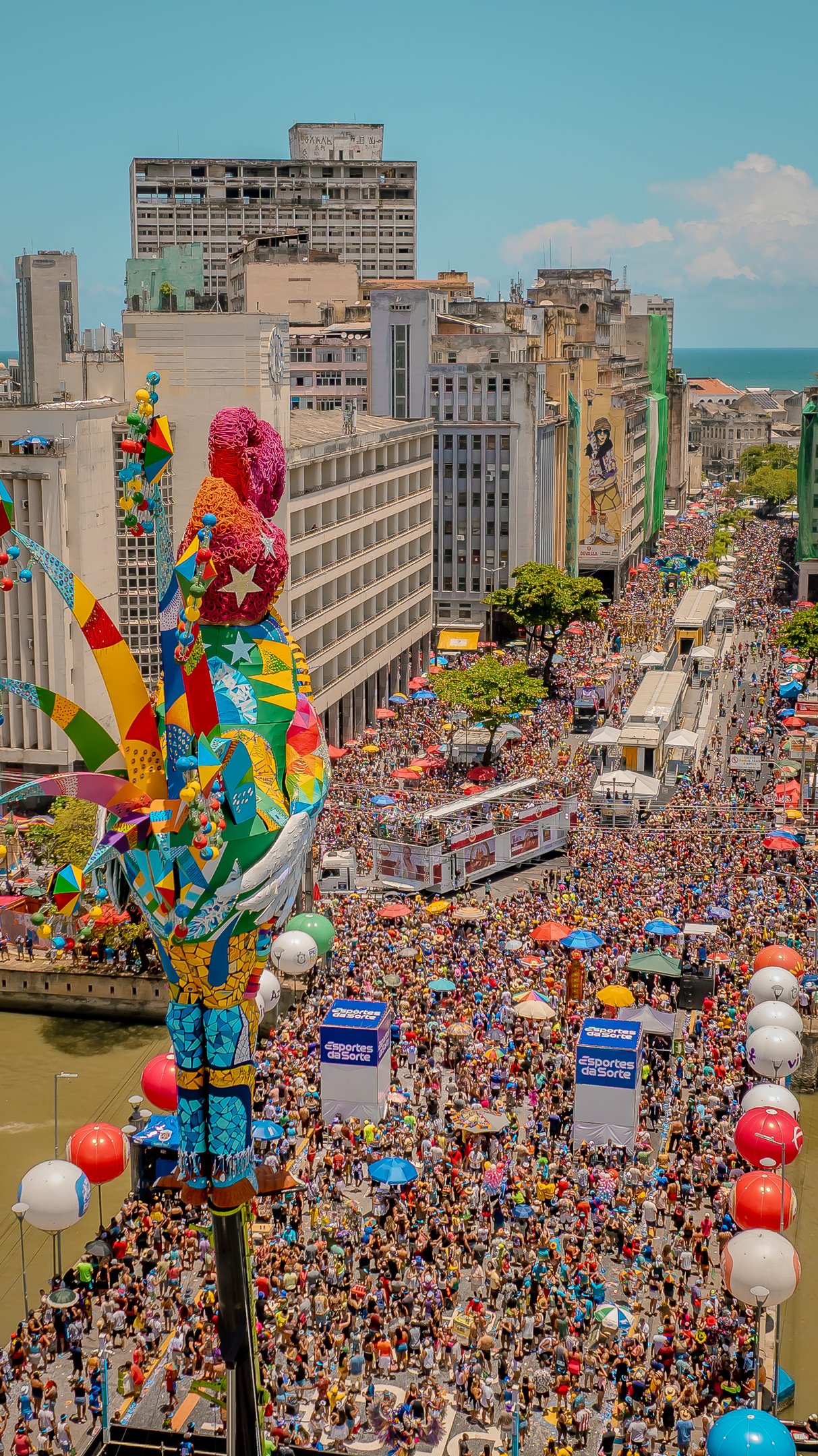 O galo gigante no meio da Ponte Duarte Coelho é uma das imagens mais conhecidas do bloco. A escultura é montada num guindaste e fica estacionada no local até o término dos festejos.