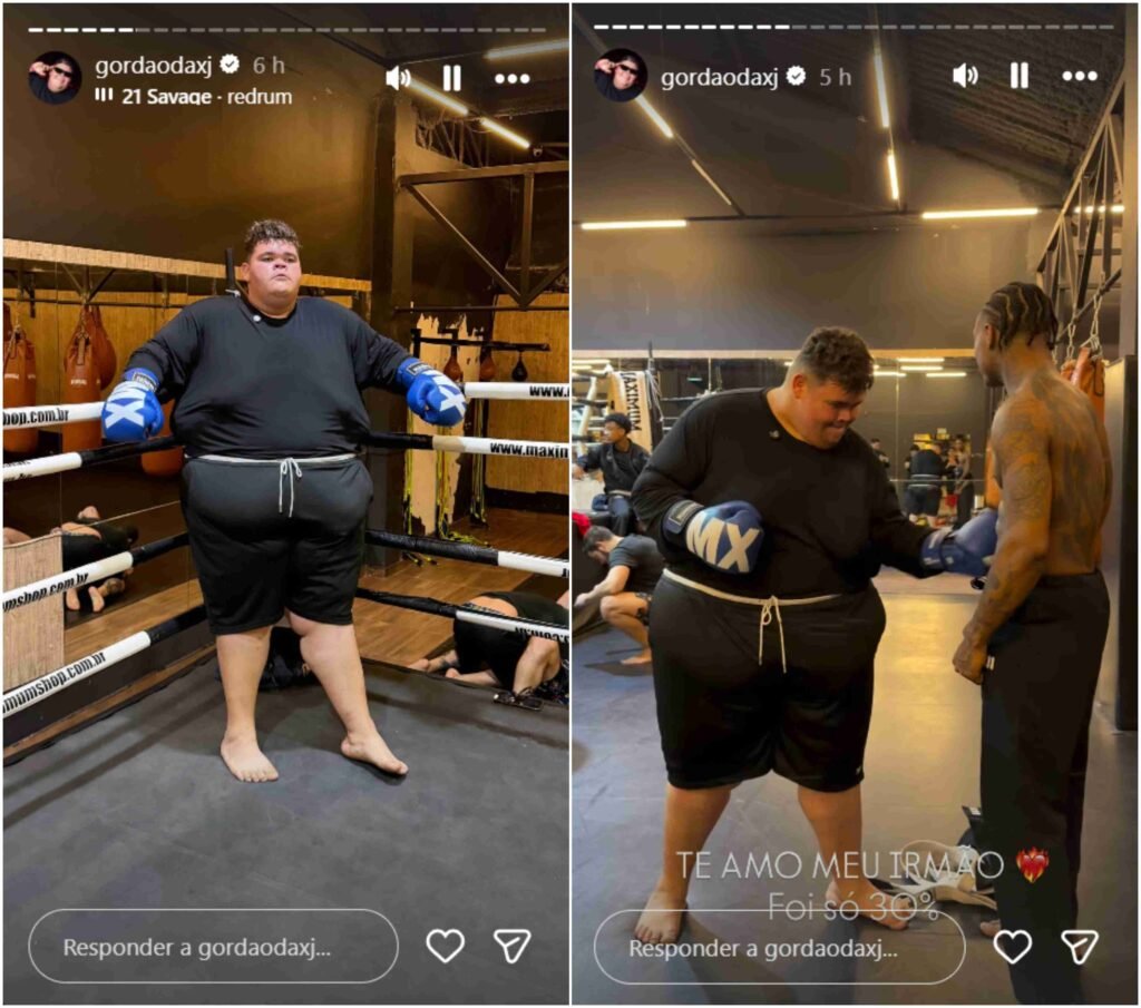 O influenciador está praticando muay thai. Nesta quarta-feira, 17, ele esteve com o professor Felipe Freitas em uma academia. Com luvas de treino, Gordão da XJ subiu ao ringue ao lado do treinador e mostrou que já está familiarizado com alguns movimentos.