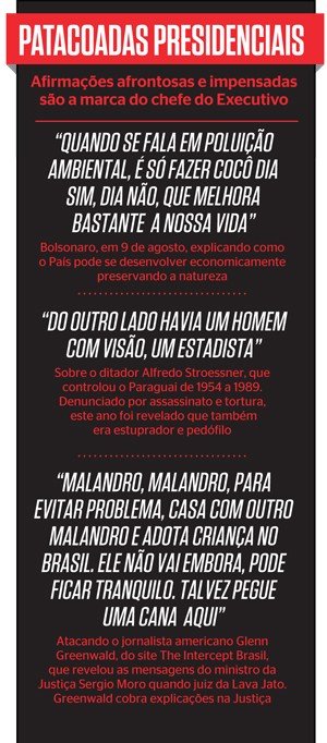 Um olhar mais distanciado e crítico indica alguma engenharia, já que todo esse caos declaratório serve como amortecedor e sedativo para obnubilar questões mais delicadas e complexas no governo. O presidente e parte de seu ministério falam barbaridades com algum conteúdo e risco, como quando Bolsonaro elogia Pinochet e Stroessner, Paulo Guedes defende o AI-5 e Ricardo Salles diz que os dados do Inpe sobre as queimadas não são confiáveis (ou tenta transferir um biólogo marinho para o sertão de Pernambuco e se reúne com notórios infratores ambientais). Um dos desatinos presidenciais foi parar no STF. O jornalista Glenn Greenwald, do site The Intercept Brasil, pediu à Justiça que Bolsonaro esclareça o que quis dizer quando classificou como “malandragem” a adoção de duas crianças brasileiras. O jornalista americano é casado com um brasileiro, o que lhe dá todo o respaldo legal. Greenwald e colegas revelaram as mensagens do ministro da Justiça Sergio Moro com procuradores federais, quando este atuava como juiz da Operação Lava Jato.