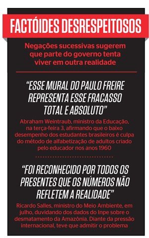 Essa falta impudica de espírito público é uma lacuna que abre espaço para um vale tudo sectário e obscurantista em nome do poder — ou só de um cargo e suas benesses. Estudioso do liberalismo e da democracia representativa, o pensador Alexis de Tocqueville afirmava, lá no início do século XIX: “A saúde de uma sociedade pode ser medida pela qualidade de funções desempenhadas por seus cidadãos”. Pior faz o ministro da Educação, Abraham Weintraub. Ele criou uma relação tóxica com reitores, educadores e estudantes ao afirmar ao Jornal da Cidade Online, em novembro, sem a menor fundamentação, que há vastas plantações de maconha em algumas universidades públicas: “A ponto de ter borrifador de agrotóxico”. A associação de reitores pede na Justiça uma retratação. Na terça-feira 3, descontente com os resultados do Brasil nas avaliações internacionais, Weintraub afirmou que a culpa do baixo desempenho dos alunos brasileiros é do educador Paulo Freire, que morreu em 1997. Freire desenvolveu um método de alfabetização de adultos em 1963 e é um dos educadores mais respeitados do mundo. Mas, para Weintraub, Freire é apenas “feio de doer”.