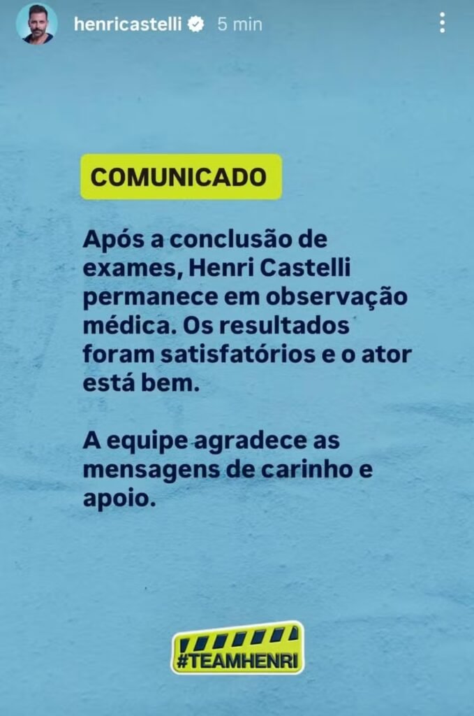 “Após a conclusão de exames, Henri Castelli permanece em observação médica. Os resultados foram satisfatórios e o ator está bem. A equipe agradece as mensagens de carinho e apoio”.