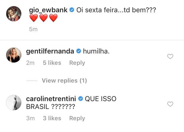 Giovanna Ewbank exibiu o corpão de lingerie em seu Instagram nesta sexta-feira (3) e comemorou a chegada de mais um final de semana. Mas o que roubou a atenção na publicação foi o comentário de Fernanda Gentil.