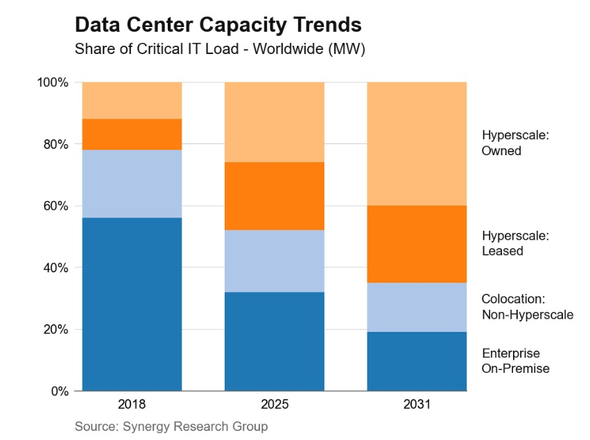 O estudo indica que, em 2031, grandes empresas de nuvem como Microsoft, Google e AWS terão 67% da capacidade global de datacenters, contra 48% registrados no ano passado. A Synergy observa que em 2025, 60% da capacidade dos hyperscalers estava em datacenters próprios (no gráfico abaixo) e o restante em instalações alugadas de outras empresas. Em cinco anos, no entanto, a capacidade própria deve aumentar.