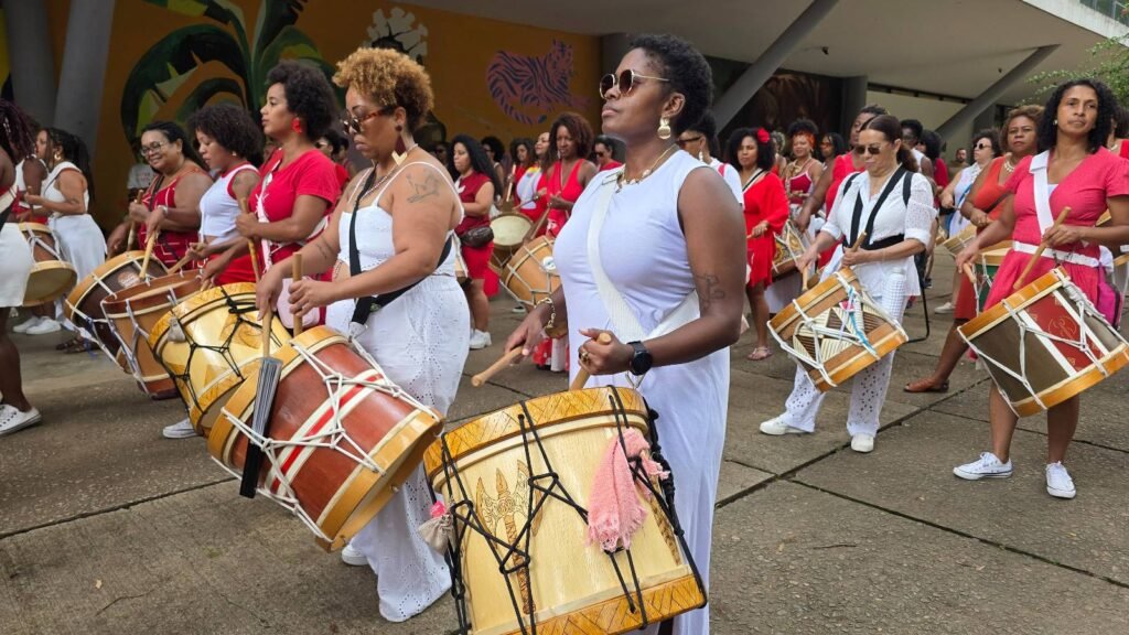 Dirigido por 23 mulheres, o Ilú Obá de Min – que quer dizer, em uma licença poética em iorubá, “mãos femininas que tocam tambor para o rei Xangô” – tem o compromisso de recontar histórias e de conquistar espaço, diz Beth. Ela salienta que, além dos pilares de educação, cultura e arte negras, a instituição tem focado em saúde. “Mulheres negras cuidam de mulheres negras”, reforça Mafalda.