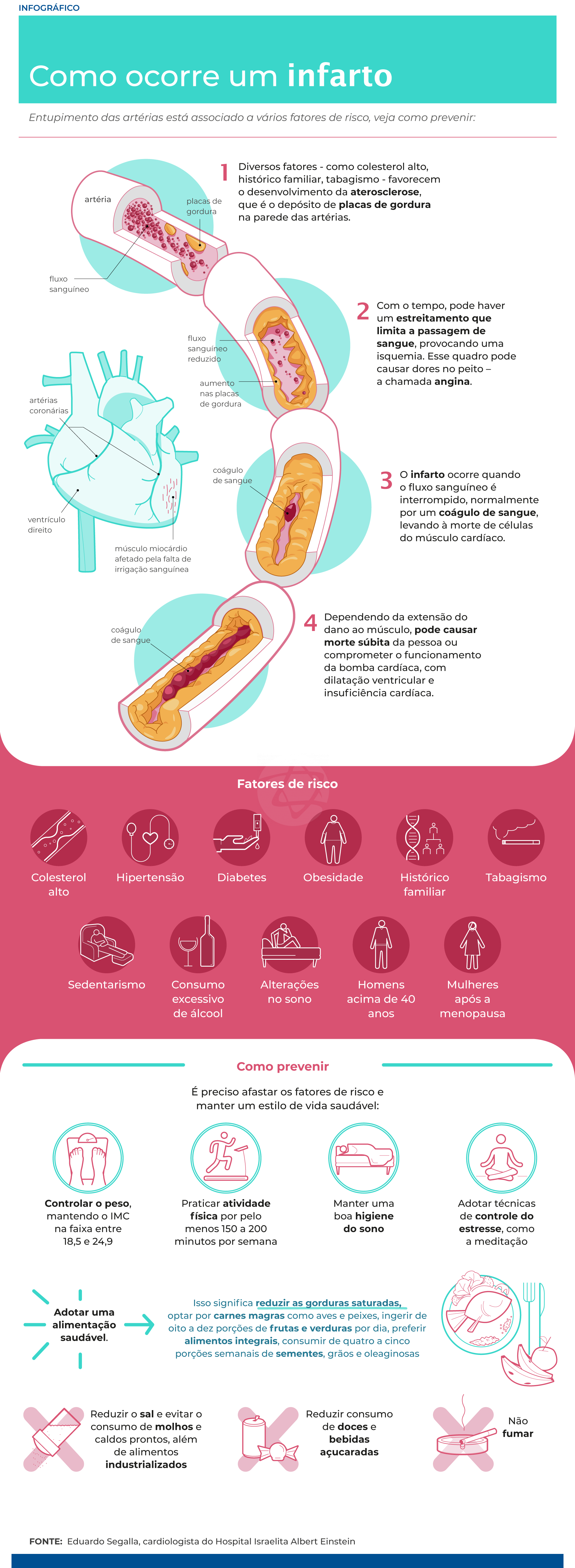 O infarto ocorre quando um coágulo interrompe o fluxo sanguíneo dentro de uma artéria, provocando a morte de células do miocárdio, o músculo do coração. Sem o tratamento correto, ele pode comprometer o funcionamento da bomba cardíaca, levando à insuficiência no bombeamento. Também pode haver a dilatação das câmaras cardíacas, o que favorece o aparecimento de arritmias, como a fibrilação atrial.