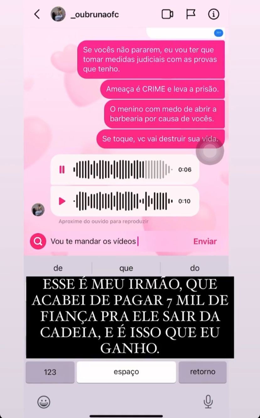 “Me escondi todos esses anos. Quando vocês perguntavam porque minha irmã mora comigo e não com minha mãe. Sobre meu irmão [Jefferson] agredir Bruna [cunhada de Priscila] grávida, desde a primeira gestação dela… Tenho muitos vídeos para mostrar. Eu não ia fazer isso aqui, ia fazer isso na Justiça. Infelizmente, ontem, foi a gota d’água. Meu irmão bateu na Bruna grávida na frente dos meus amigos. [O marido do Henrique] tem uma barbearia. Meu irmão disse que se ele abrisse a barbearia, ele ia ‘meter chumbo’. Ele falou que se filmassem, eles iam morrer”, continuou Juliana.