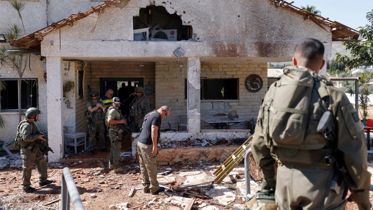 Soldados de Israel vasculham casa atingida por míssil lançado pelo Hezbollah na região de Moshav Kfar Yuval