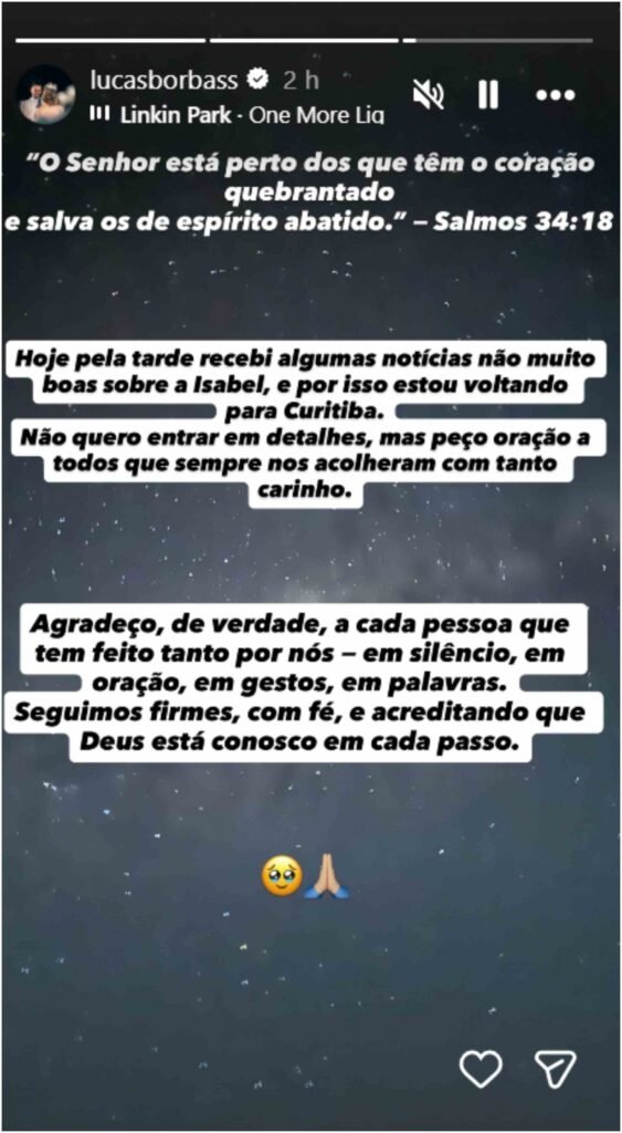 “Hoje, pela tarde, recebi algumas notícias não muito boas sobre a Isabel e por isso estou voltando para Curitiba. Não quero entrar em detalhes, mas peço oração a todos que sempre nos acolheram com tanto carinho. Agradeço, de verdade, a cada pessoa que tem feito tanto por nós – em silêncio, em oração, em gestos, em palavras. Seguimos firmes, com fé, e acreditando que Deus está conosco em cada passo”, escreveu ele em publicação nos Stories do Instagram.
