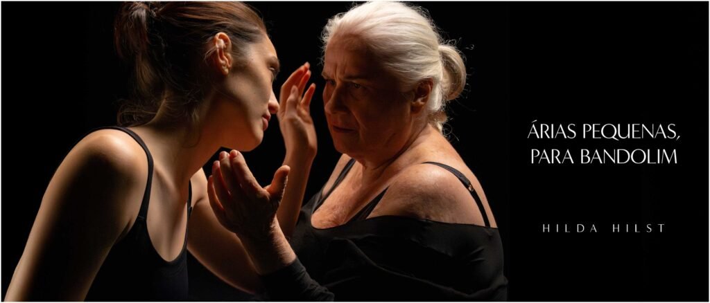 Essa dimensão viva e sensorial da obra é aprofundada por Vera Holtz, que traduz em palavras a experiência corporal e imagética proposta pelo curta. Para a atriz, a poesia de Hilda Hilst atravessa o tempo, os personagens e o próprio corpo, ativando memórias, silêncios e desejos. “As sensações da poesia de Hilda estão impressas em marcas indeléveis no meu corpo. Elas atravessam personagens, camadas profundas, silêncios e gestos. Em Árias Pequenas, Para Bandolim, as cordas tocam os corpos em novelos, a imagem percorre minhas rugas com delicadeza, o tempo se dilata. Tudo ressoa como vitalidade e desejo, nos olhares, nos lábios, na matéria viva da cena. A poesia de Hilda transforma os dias em palavras líquidas, secretas, para serem ditas e vividas intensamente, antes que o mundo acabe.”