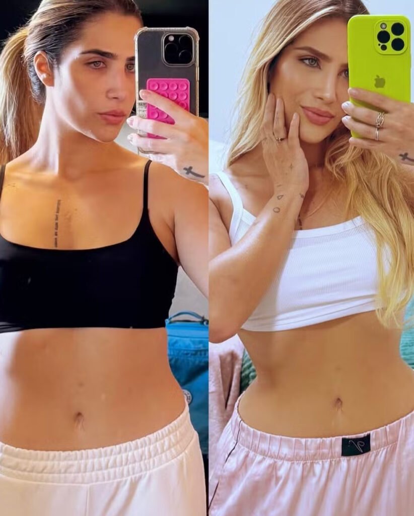 Jéssica Beatriz Costa, filha do cantor Leonardo, de 32 anos, divulga nas redes sociais um “antes e depois” de sua silhueta. A influenciadora mostra o resultado de um novo processo de emagrecimento, revelando mudanças significativas em suas curvas após adotar uma nova rotina. O compartilhamento do progresso tem repercutido entre seus seguidores.