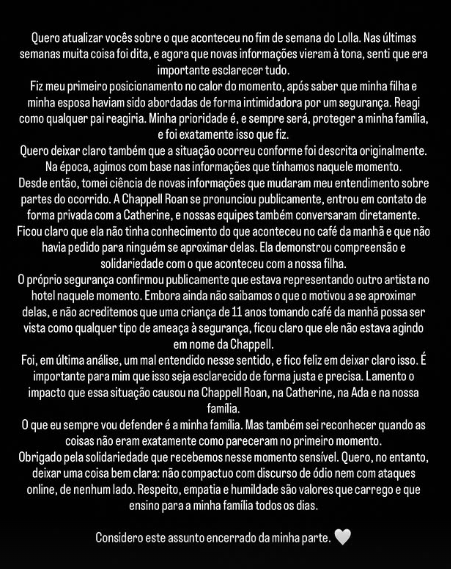 “Quero atualizar vocês sobre o que aconteceu no fim de semana do Lolla. Nas últimas semanas, muita coisa foi dita, e agora que novas informações vieram à tona, senti que era importante esclarecer tudo.