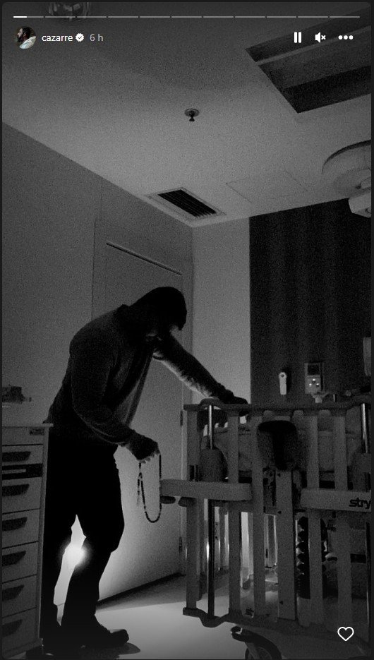 O ator Juliano Cazarré usou suas redes sociais nesta terça-feira (20) para compartilhar um momento emocionante ao lado de sua filha Maria Guilhermina, de apenas seis meses. A criança foi transferida para um hospital no Rio de Janeiro (RJ) para continuar o tratamento de uma cardiopatia rara – chamada Anomalia de Ebstein. Na foto, Juliano aparece rezando com um terço ao lado da cama do hospital.