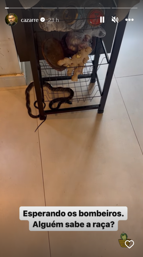 O intérprete de Pascoal em ‘Fuzuê’, novela das 19h da Globo, encontrou o réptil na cozinha, embaixo de uma fruteira. O ator registrou em vídeo a presença da visitante indesejável e publicou nos Stories, o ator se deparou com a presença de uma cobra em sua cozinha.