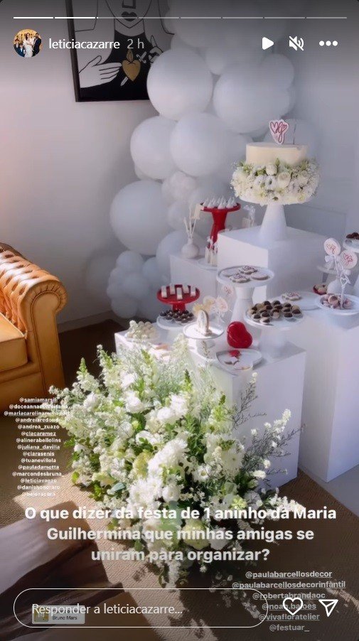“O que dizer da festa de 1 aninho da Maria Guilhermina que minhas amigas se uniram para organizar?”, comemorou Letícia em uma publicação no Instagram, apresentando a decoração da festa.