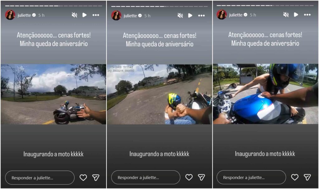 Juliette, de 36 anos, se manifestou sobre ter sofrido uma queda da moto que ganhou de aniversário do noivo, Kaique Cerneny, 27, na última quarta-feira, 3, um veículo de luxo, modelo BMW S 1000 RR, avaliado em R$ 140 mil. Nas imagens que registraram o pequeno acidente é possível perceber que a cantora não se machucou seriamente. Ela aparece sendo ajudada por um homem, aparentemente funcionário do condomínio onde ela mora, no Rio de Janeiro.