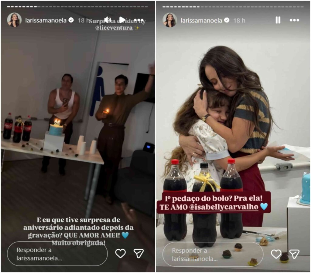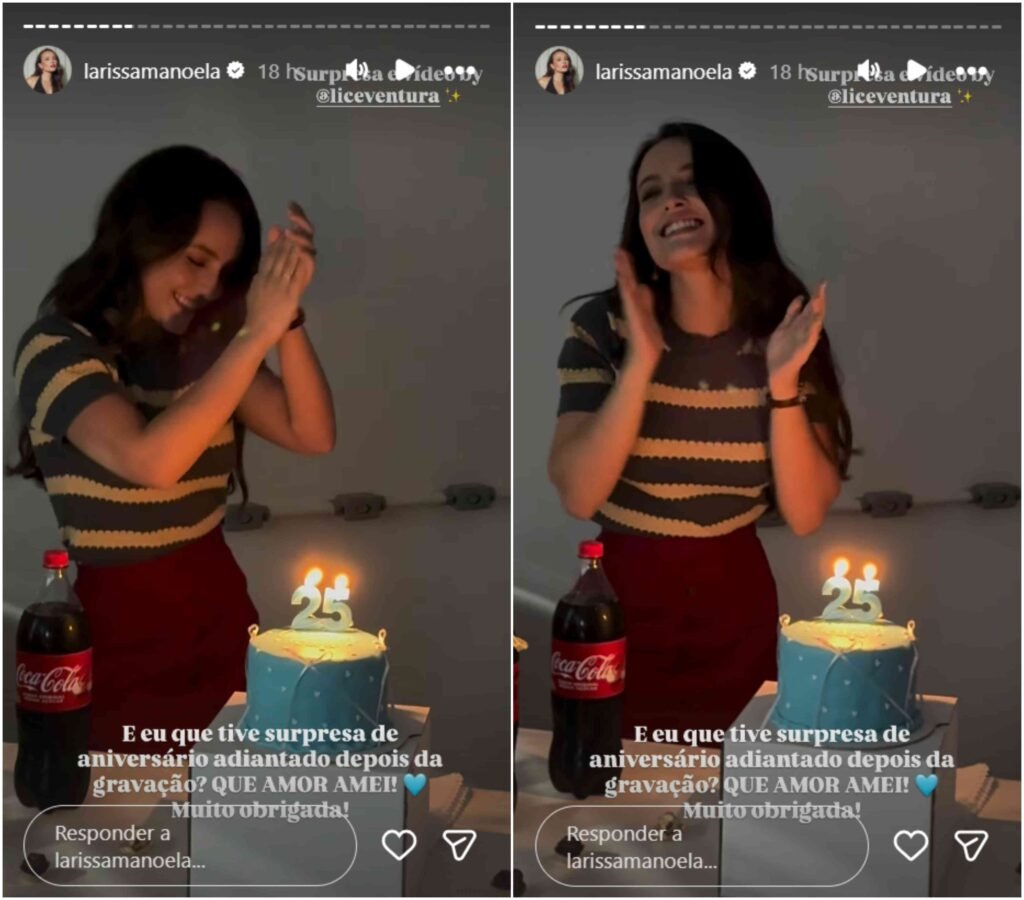 “E eu que tive surpresa de aniversário adiantado depois da gravação? Que amor. Amei! Muito obrigada!”, comemorou ela.