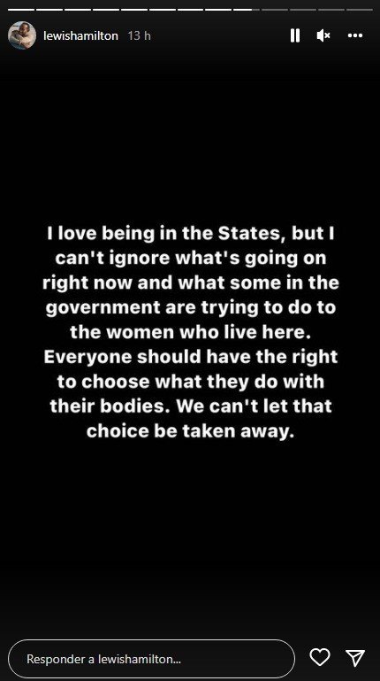 O piloto da Mercedes usou suas redes sociais para dar sua opinião sobre o aborto no país norte-americano. “Eu amo estar nos EUA. Mas não dá para ignorar o que está acontecendo e o que uma parte do governo está tentando fazer com as mulheres que vivem aqui. Todo mundo deveria ter o direito de escolher o que fazer com o próprio corpo. Não podemos deixar que esse poder de escolha seja tirado”, escreveu o britânico.