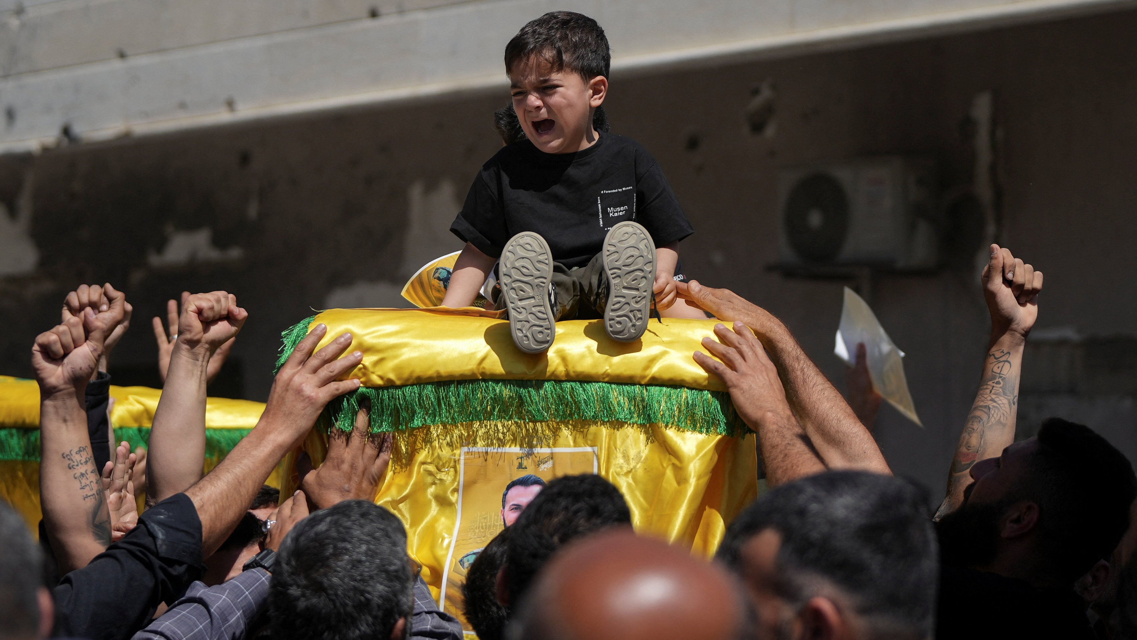 Uma criança chora sentada sobre o caixão de um membro do Hezbollah morto durante o conflito com Israel, durante um funeral em Mansouri, Líbano, em 23 de abril de 2026.