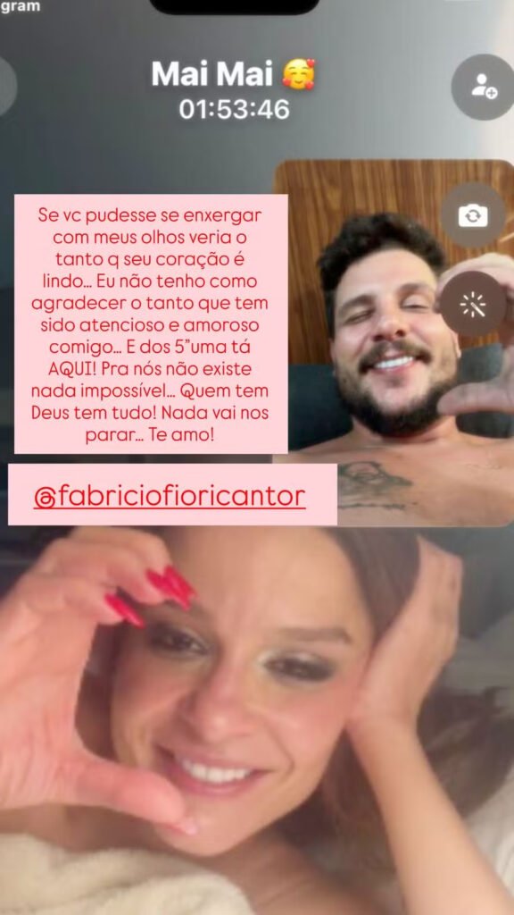 Na publicação, a artista não economizou nas palavras e fez uma declaração afetuosa. “Se você pudesse se ver com meus olhos, entenderia o quanto seu coração é lindo… Sou muito grata por todo o carinho e atenção que tem comigo”, escreveu. Ela ainda reforçou a conexão entre os dois ao dizer que, com fé, não há obstáculos: “Para nós, nada é impossível… Quem tem Deus, tem tudo. Nada vai nos parar. Te amo”.