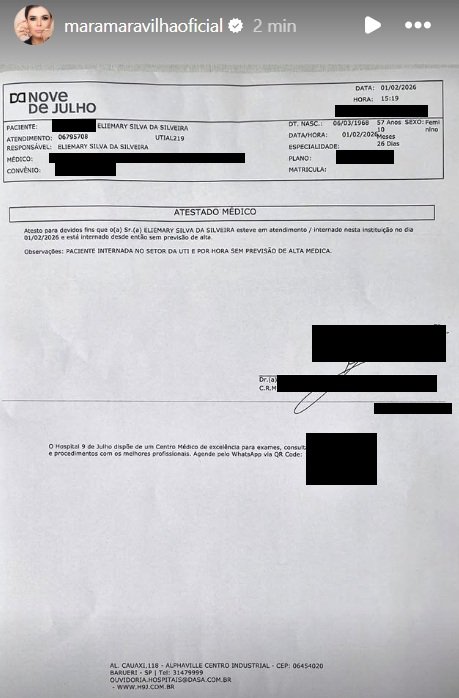 A artista confirmou o problema de saúde ao publicar uma imagem do atestado médico e ainda fez um desabafo aos seguidores em que falou sobre ameaças e perseguições. No documento divulgado há algumas horas, os médicos informaram que Eliemary Silva da Silveira – nome de batismo de Mara – segue internada no setor de terapia intensiva, mas não detalha o motivo da internação.