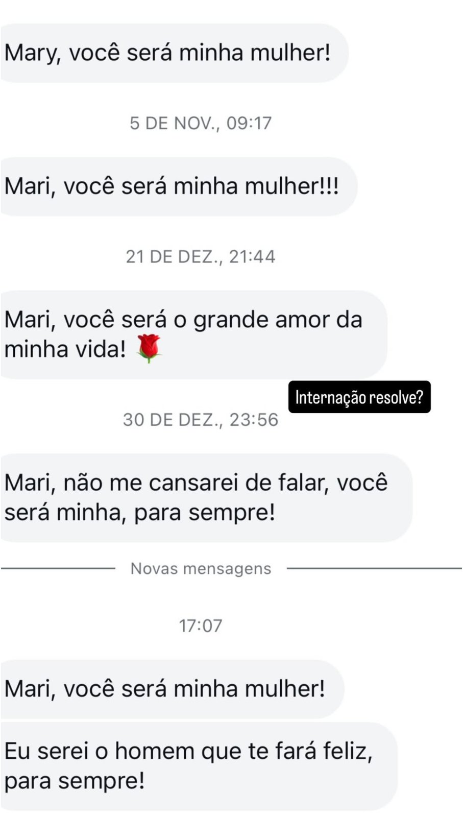Foram pelo menos três ocasiões em que o usuário enviou mensagens. “Mari, você será minha mulher!”, diz uma delas. “Mari, você será o grande amor da minha vida”, diz outra. “Não me cansarei de falar: você será minha para sempre” e “Eu serei o homem que te fará feliz para sempre”, insistiu ele.