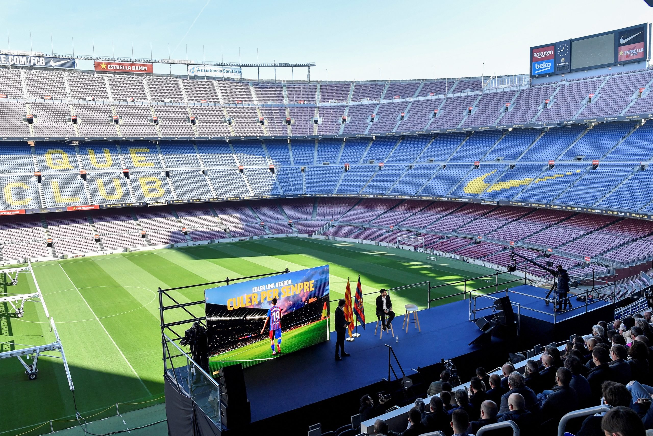 - Barcelona’s Argentinian forward Kun Aguero (C) addresses a press conference to announce his retirement from football, at the Camp Nou stadium in Barcelona, on December 15, 2021. (Photo by Pau BARRENA / AFP)