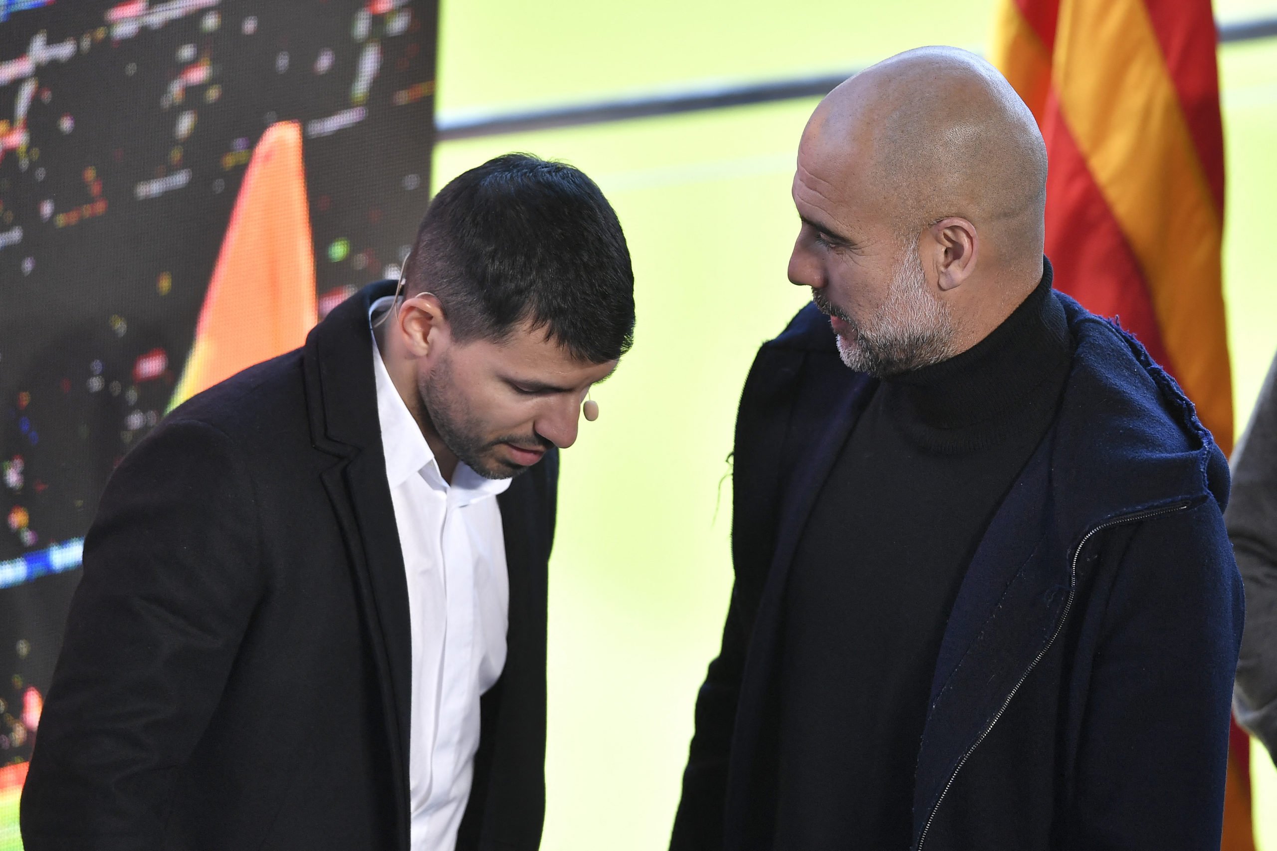 - Barcelona’s Argentinian forward Kun Aguero (L) speaks with Former FC Barcelona’s Spanish player Pep Guardiola during a press conference to announce his retirement from football, at the Camp Nou stadium in Barcelona, on December 15, 2021. (Photo by Pau BARRENA / AFP)